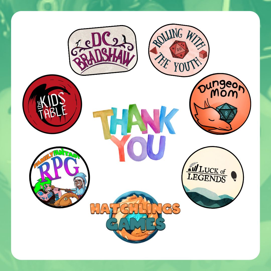 AND... thank you to the TTRPGkids site sponsors! These awesome people are supporting future TTRPGkids projects, allowing me to go to conventions, pre-fund art for future projects, and generally supporting the resource; please go check out their work and support them as well!
